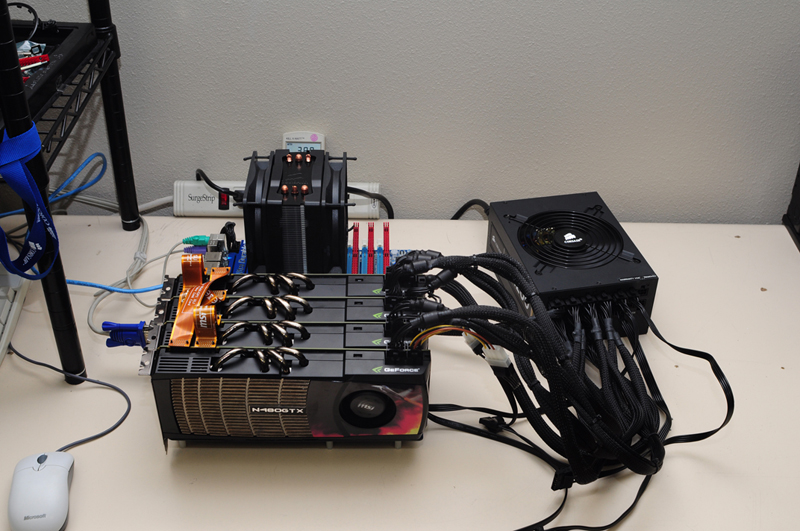 La gente de Corsair realizó este test con la configuración de 4 Tarjetas Gráficas o comúnmente llamado 4-Way SLI, el cual podria ser el de mayor consumo de energía actualmente.